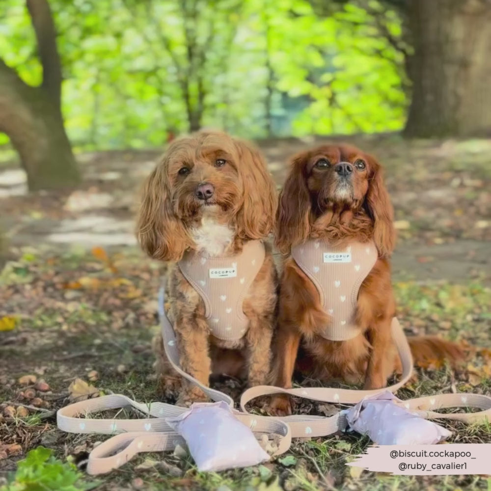 Whether it’s a stroll through the park or a coffee run with your pup in tow, the Chai Hearts Adjustable Neck Harness brings cuteness and confidence to every outing. The nude cord material is super soft, and the white embroidered hearts are totally adorable!