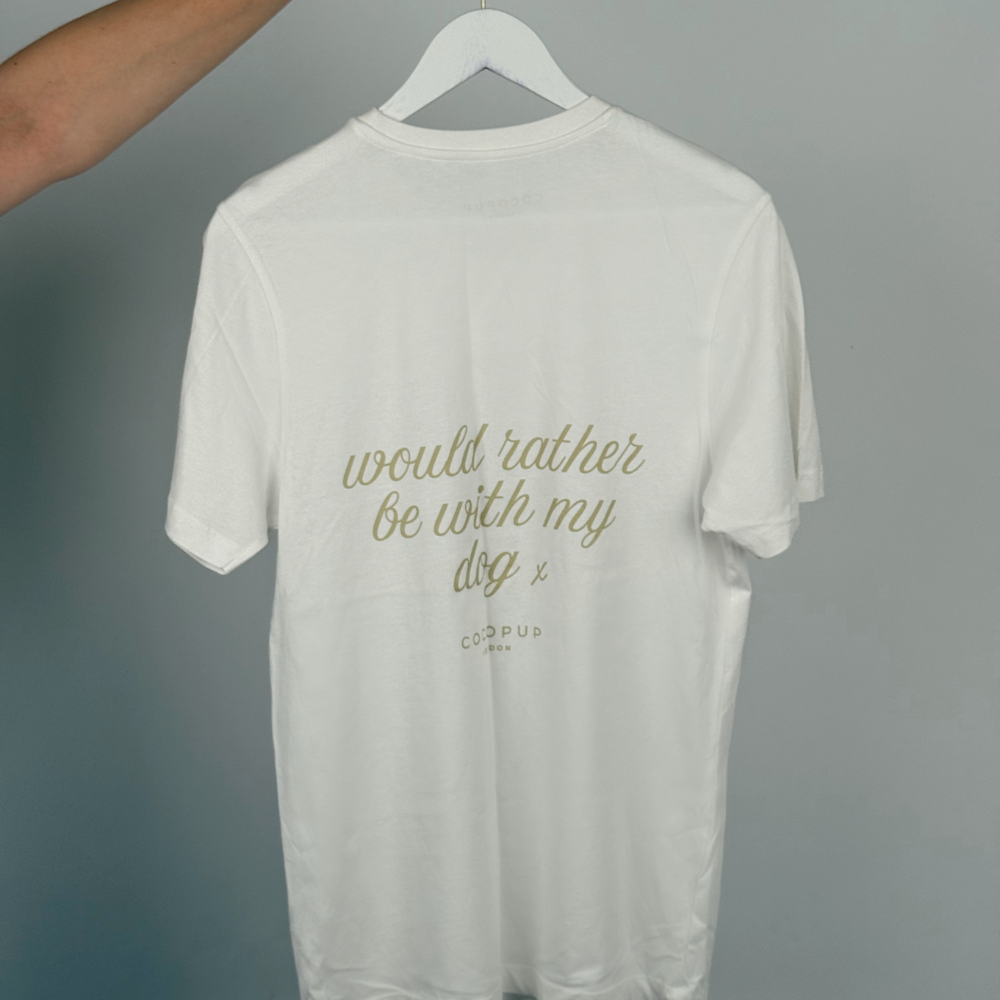 Get ready for some serious puppy love with our Cocopup Crew T-shirt! This white unisex tee features a playful back print that boldly proclaims "would rather be with my dog". Perfect for any dog lover, this shirt is sure to bring a smile to your face (or your furry friend's).
