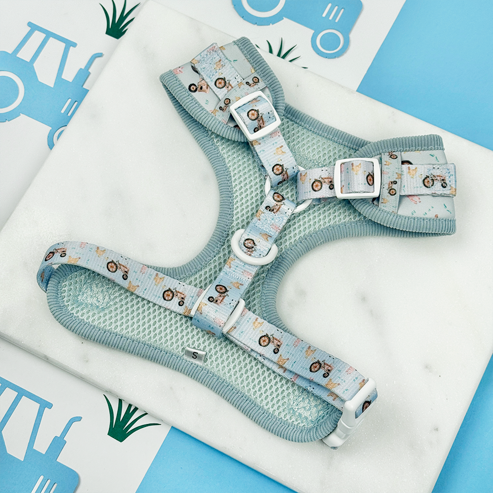 Introduce your farm loving pup to countryside charm with our Barnyard Buddies Adjustable Neck Harness. Featuring a delightful farmyard design complete with tractors, cows, pigs, ducks, and chickens in cheerful blue tones, this harness brings spring spirit to every dog walk. The adjustable fit grows with your furry friend, ensuring comfort and security whether you're exploring country lanes or enjoying pastoral adventures. Perfect for the dog who dreams of farm life!