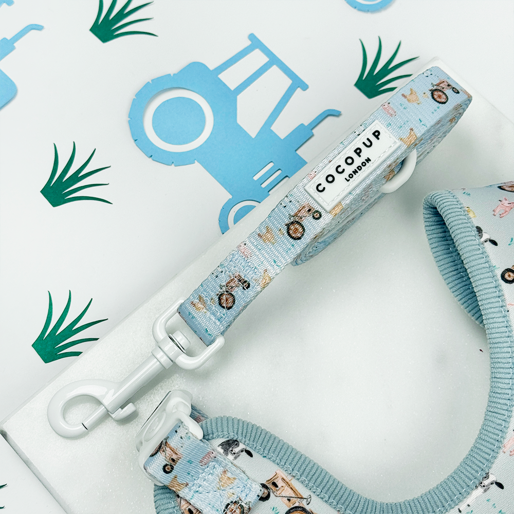 Take your farm loving pup on countryside adventures with the Barnyard Buddies Lead. This cheerful blue design brings the charm of rural life to every walk, featuring tractors, cows, pigs, ducks, and chickens. Perfect for dogs who dream of open fields and pastoral scenes, it captures that spring time spirit. Whether you're strolling through the countryside or enjoying a country pub lunch, this lead combines practical durability with delightful character that'll have fellow dog walkers smiling.