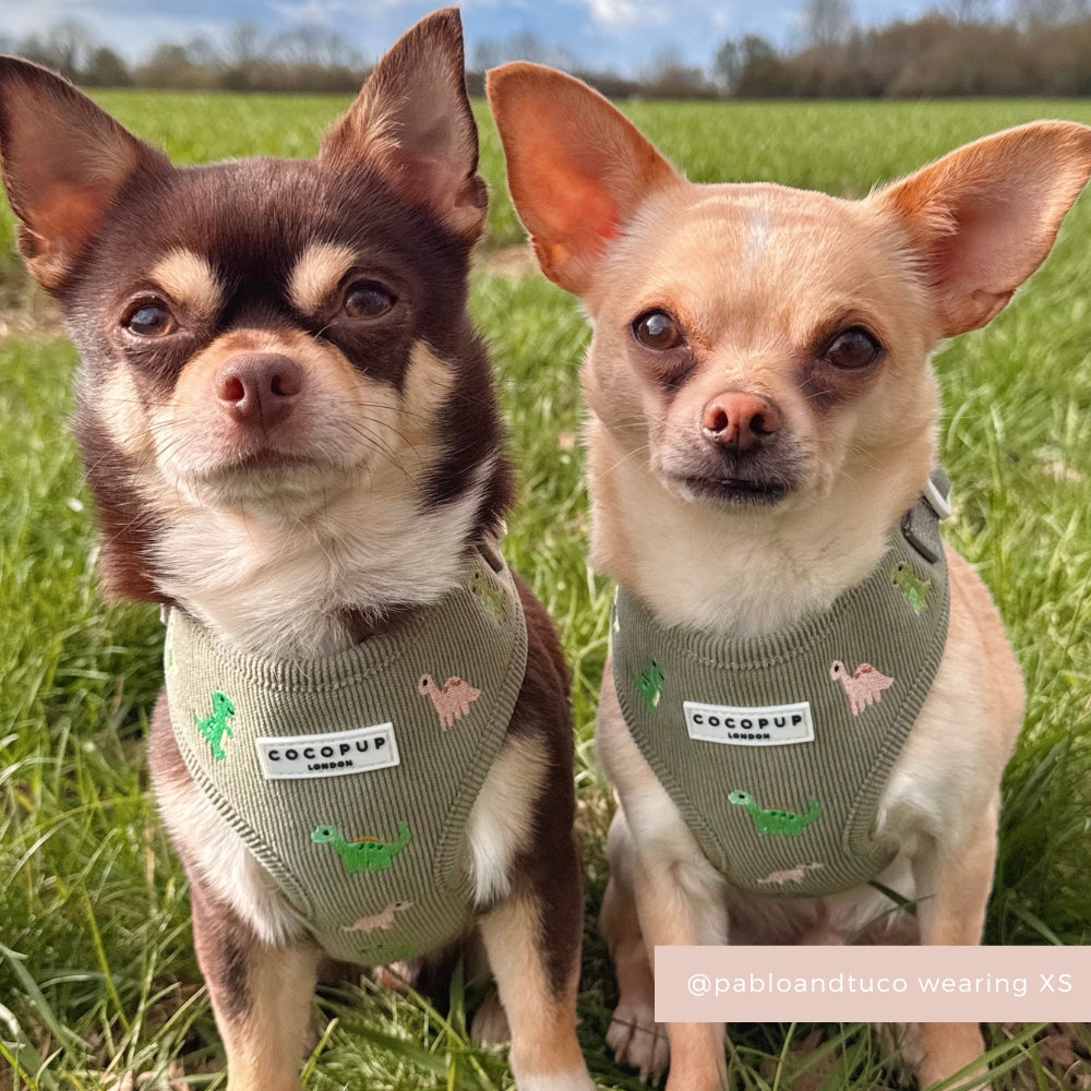 Ready for your Jurassic debut in our Dino Doodles Dog Harness. Ditching the basic for something rawr-some, this Harness features adorable embroidered dinosaurs set against a trendy earthy green backdrop. It’s the ultimate combination of olive tones and high-end texture, designed for the  most adventurous "T-Rex" pups.