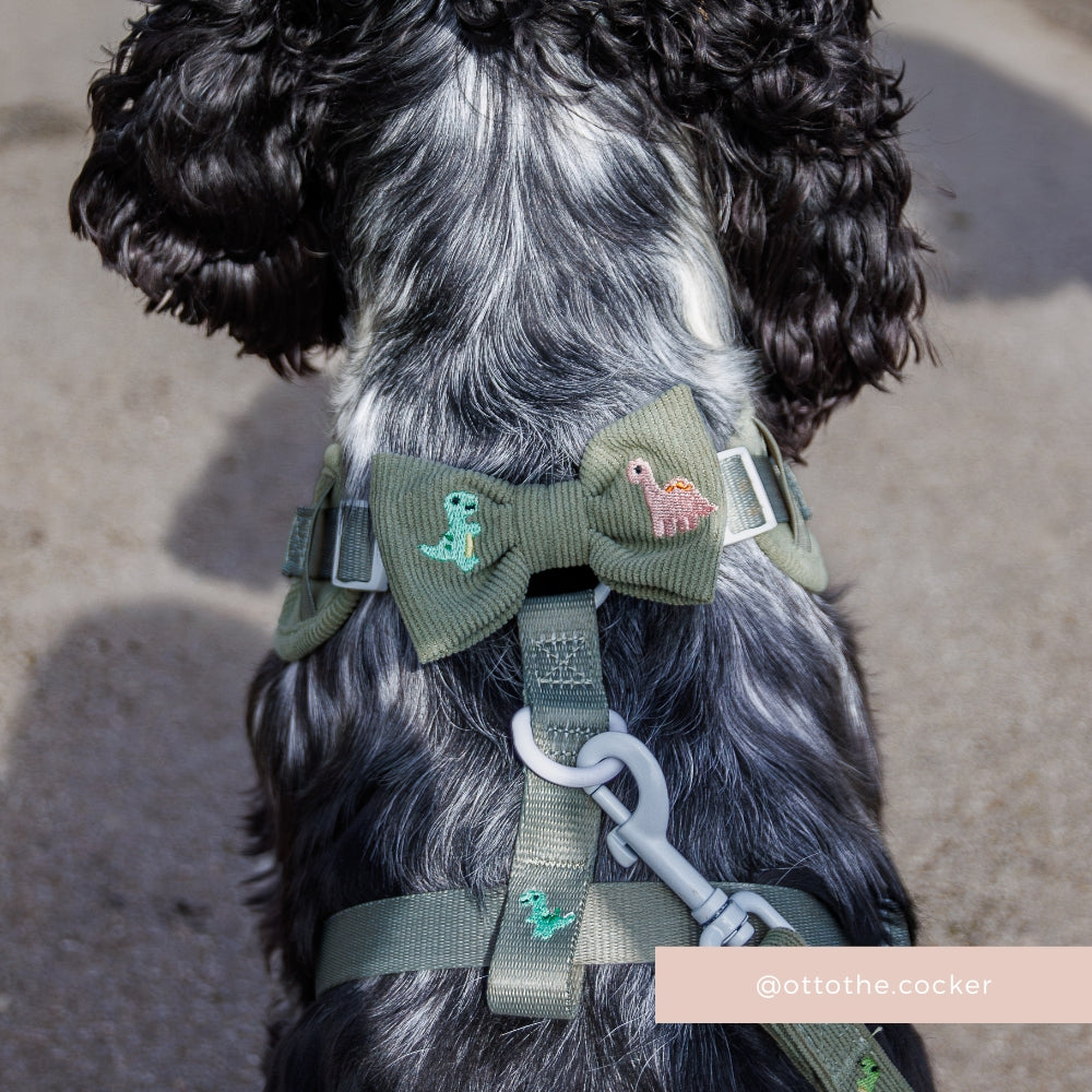 Bring a splash of prehistoric charm to dogs walking kit with this adorable bow tie featuring embroidered dinosaurs doodles on the trending olive green backdrop. Perfect for pups who love a bit playful style. A fun way to show off their wild side!