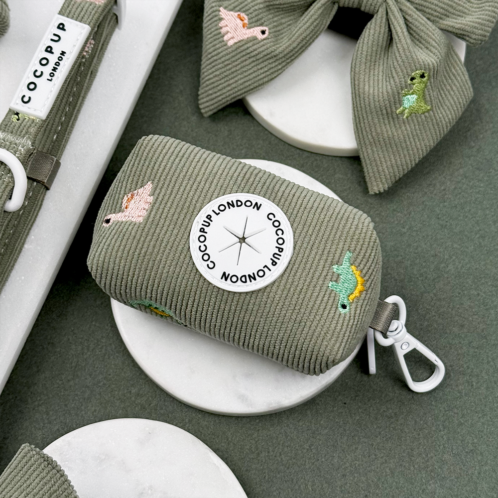 Green corduroy material Dog Poop Bag Holder with embroidered dinosaurs.
