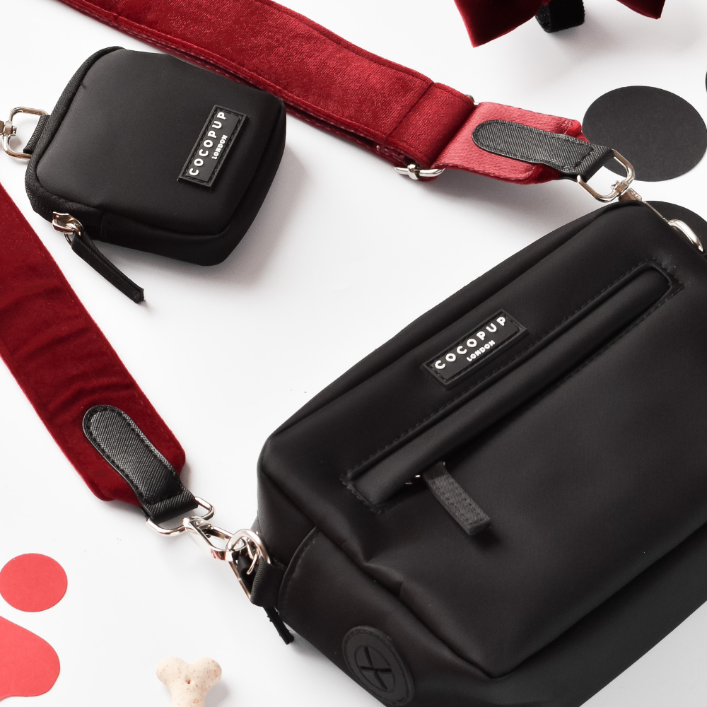 Our Bag Bundle includes: Black Bag, Treat Pouch & Berry Red Velvet Strap (with inbuilt poop bag dispenser!)
