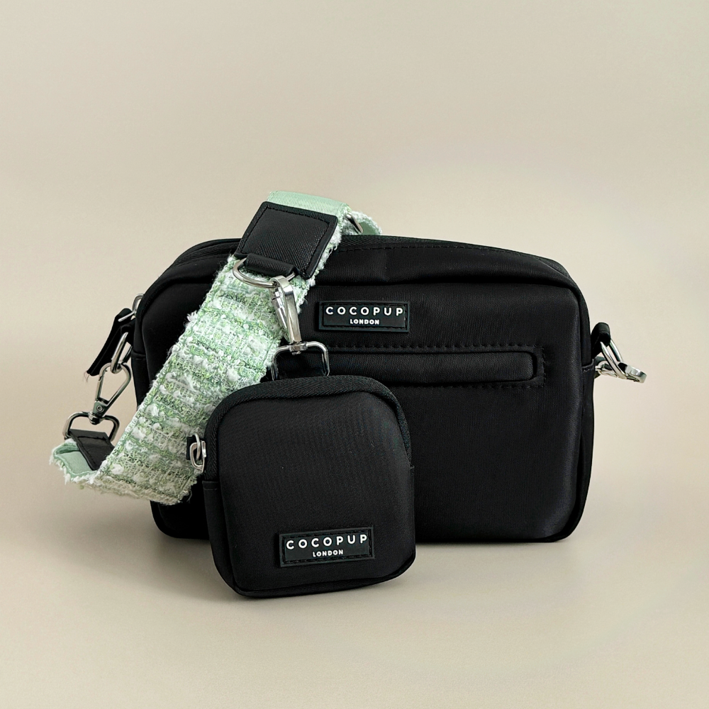 Our Bag Bundle includes: Bag, Treat Pouch & Matcha Textured Tweed Bag Strap