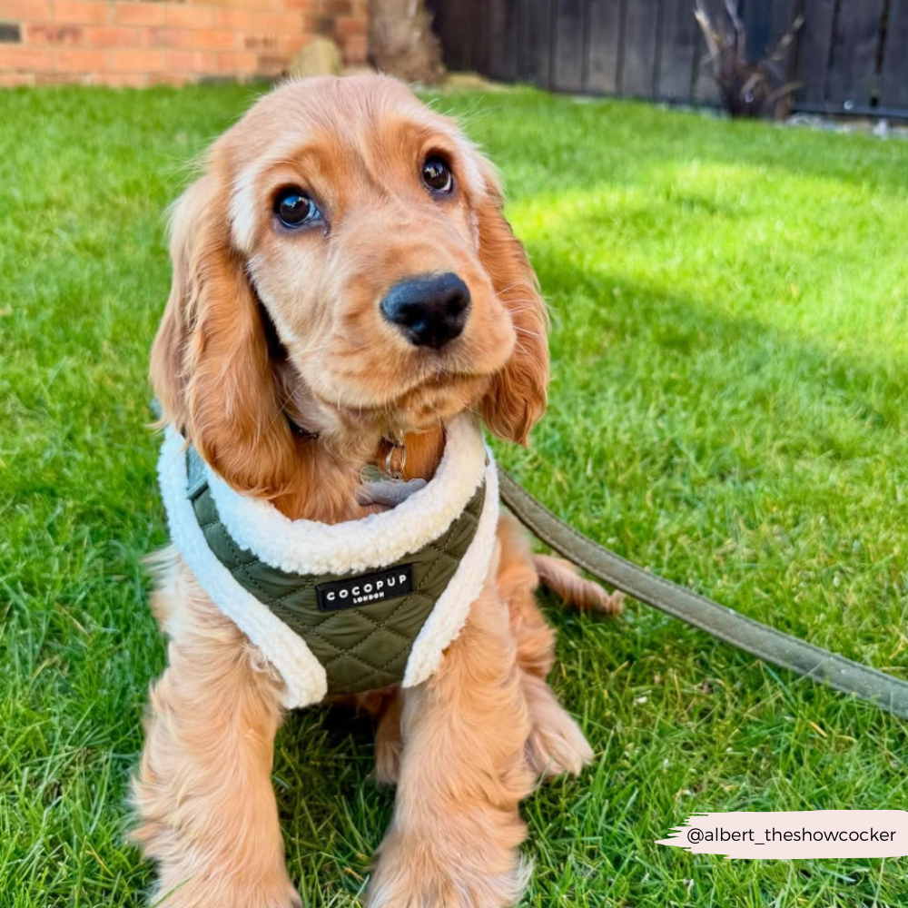 Olive quilted dog harness with white fleece lining from COCO PUP London.
