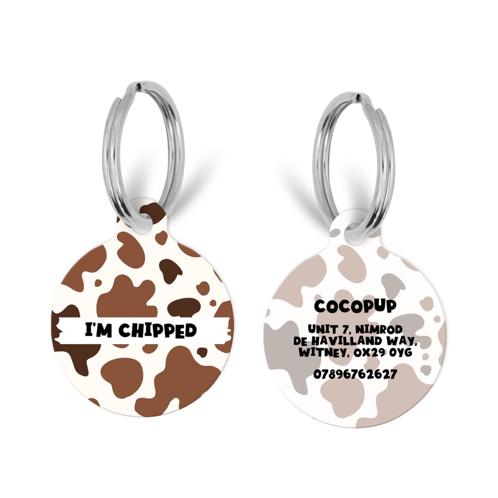 The dog ID tag is double sided, the front features our Rodeo Pup print with the option to add your own personalised text on the front. On the back we can print key important information such as your last name, address and phone number.
