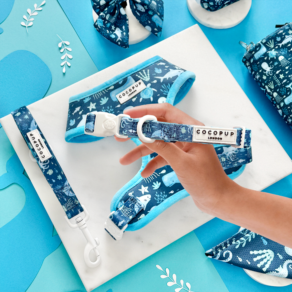 Take a walk on the wild (or underwater) side with the Sea Life Pawty bundle. Featuring adorable turtles, dolphins, and sharks, this adjustable neck harness, lead, and collar set will make every dog walk feel like a day at the beach. Plus, with safety locks on both the collar and harness buckle, your pup will be secure and stylish all summer long!