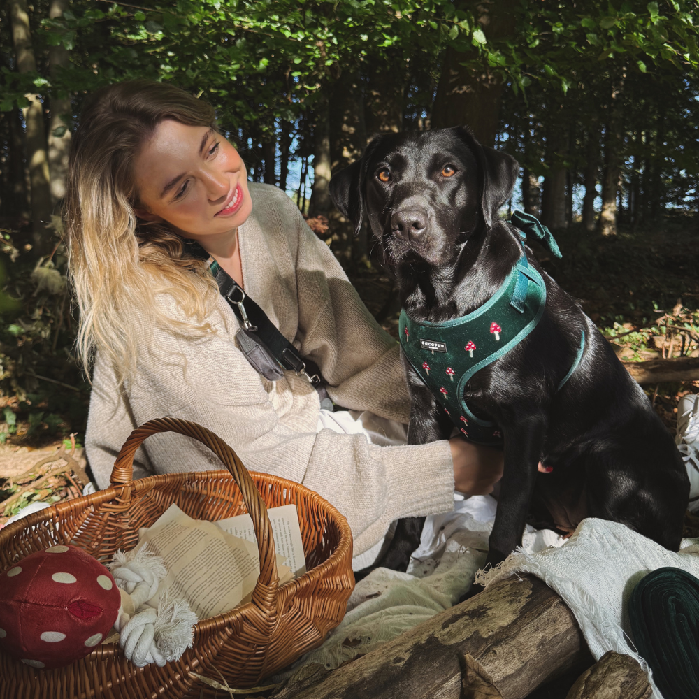 Make autumn dog walks extra charming with the Toadstool Trails Adjustable Neck Harness. Crafted from green velvet embroidered with a cute toadstool, it combines playful style with practical safety thanks to its secure lock buckle. Perfect for strolls in the woodland!